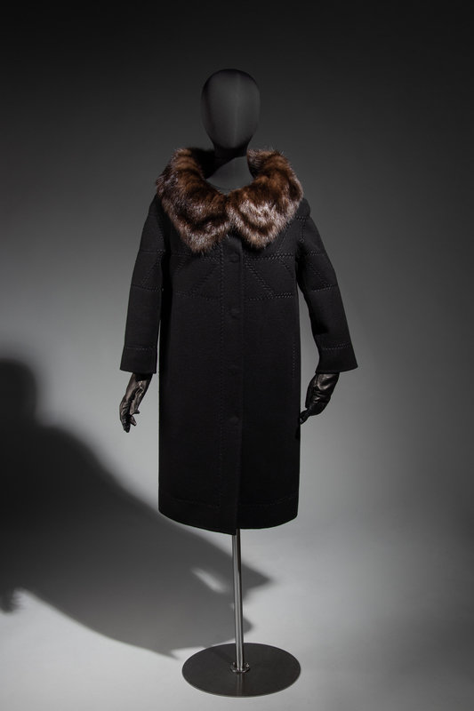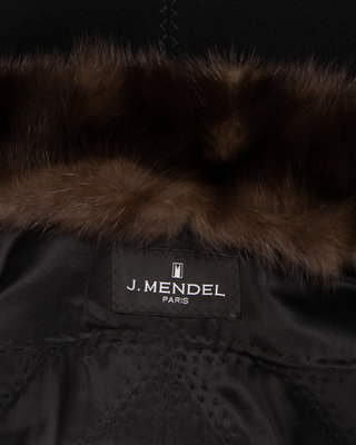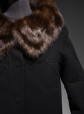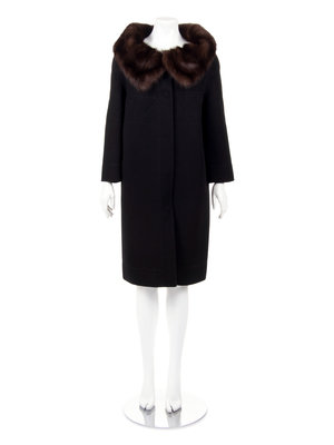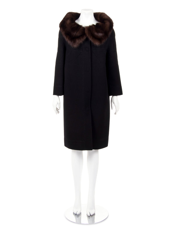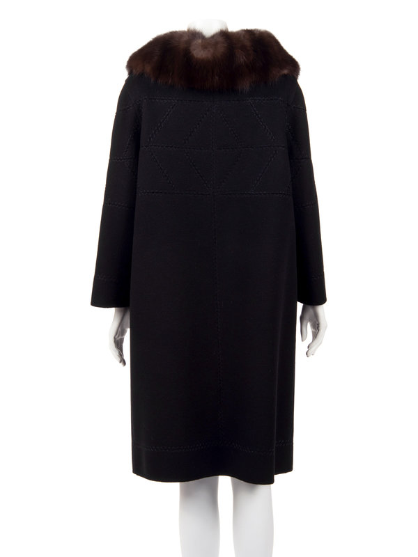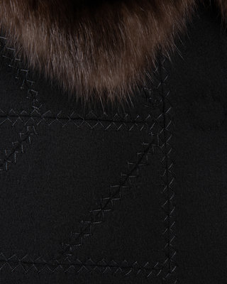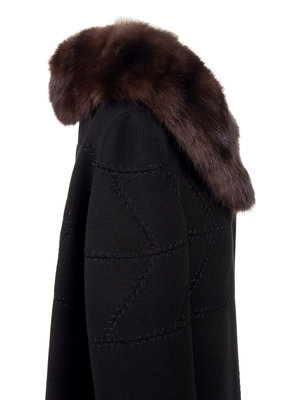 Black cashmere coat with brown sable collar, 3/4 length sleeves, decorative stitching, and center front snap closures.