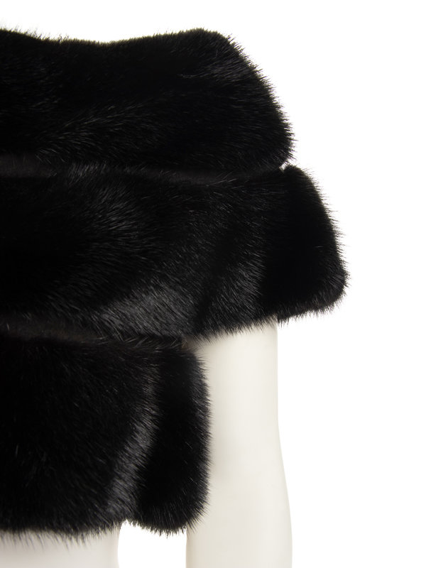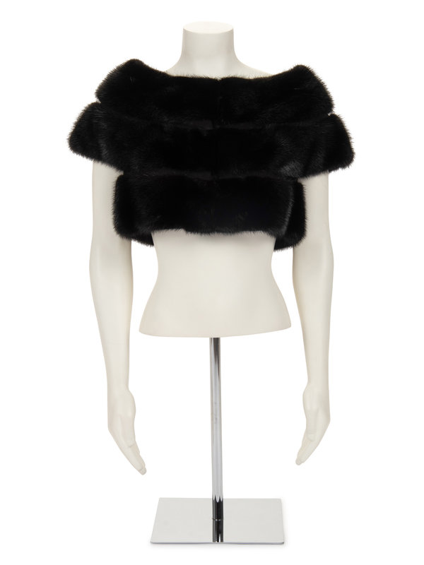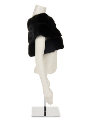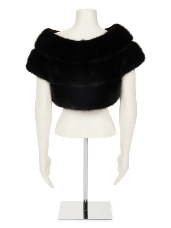 Black mink fur short sleeved cropped jacket with center front hook and eye closure. "Michelle" monogrammed on front right lining.
