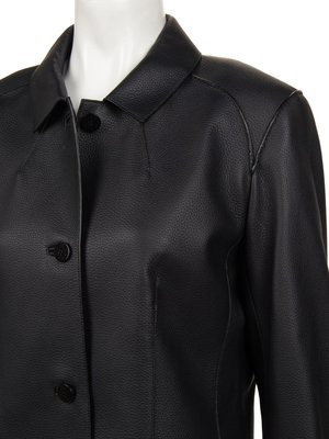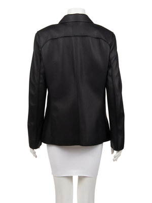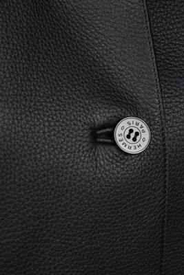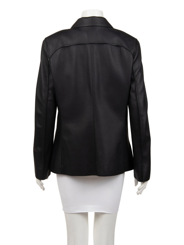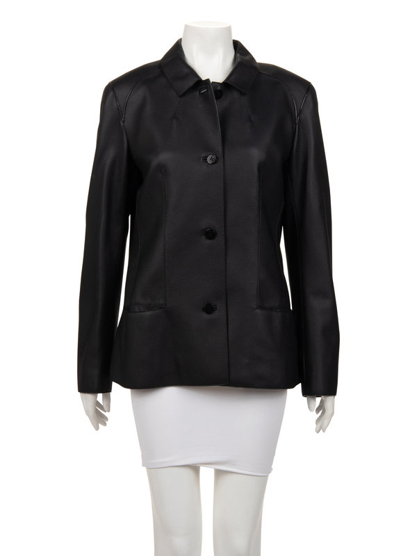 Black deerskin box-cut jacket with rolled pointed collar, front hip inseam slit pockets, exterior seam details, and center front button closure.