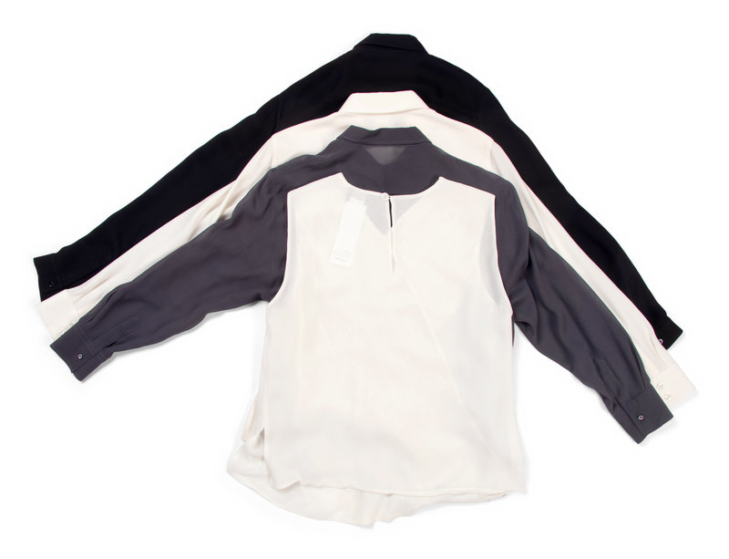 Gray silk chiffon dress shirt with faced front bib, pointed collar, barrel cuff long sleeves, and hidden front button closures.