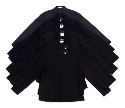 Black silk crepe button down shirt with pointed collar, barrel cuff long sleeves, and satin hidden center front button closure.