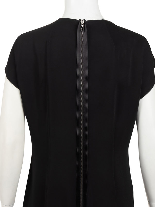 Black silk sleeveless caftan with sheer black inset at V-neckline and zipper closures at center back at left seam.