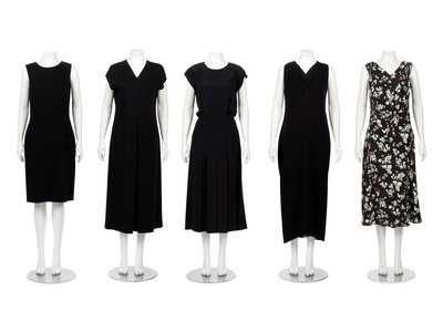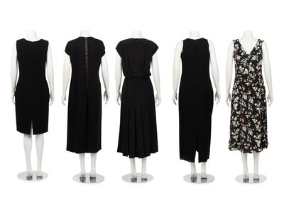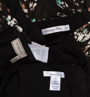 Four Dresses and One Jumpsuit: One Christian Dior, One Gucci, One Attributed to Dior, One Oscar de la Renta, and One Lanvin Jumpsuit