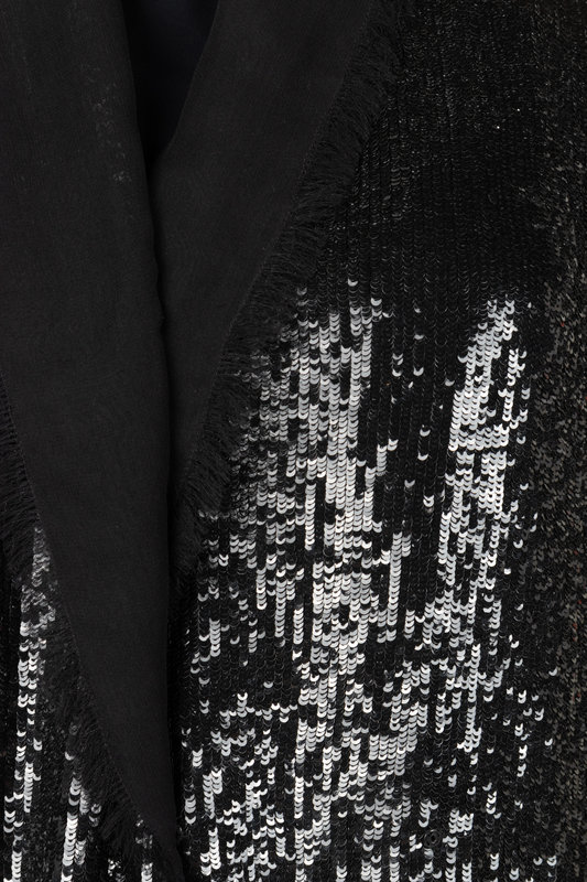 Black silk open vest covered in black sequins with two snap closures on center front and trimmed with short black silk fringe.