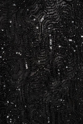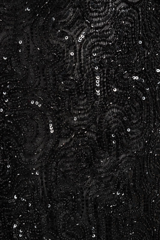 Black silk pants with a black lace overlay embroidered with black sequins.