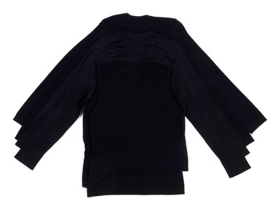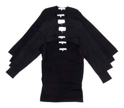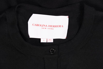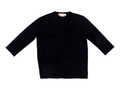Black silk/cotton blend knit cardigan with jewel neckline, banded long sleeves and hemline, and center front button closures. Found with original sales tag, listed price: $1,090.00.