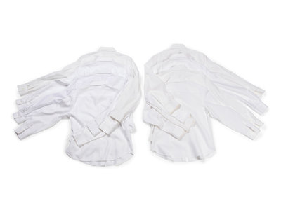White cotton twill weave dress shirt with pointed collar, barrel cuff long sleeves, and center front button closure.