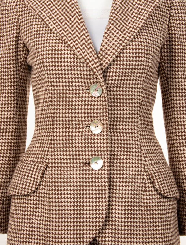 Brown and ivory wool houndstooth two-piece skirt suit including a peaked lapel jacket with flap hip pockets and center front shell button closure; paired with matching box pleat skirt with dual side zipper closures.