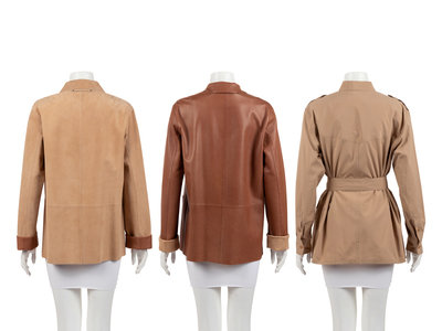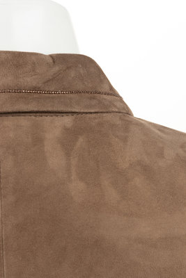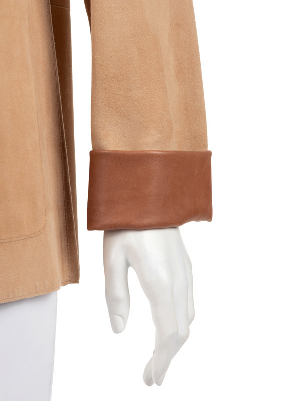 Beige suede and brown goat skin leather reversible jacket with pointed collar, front hip patch pockets, and center front button closure.