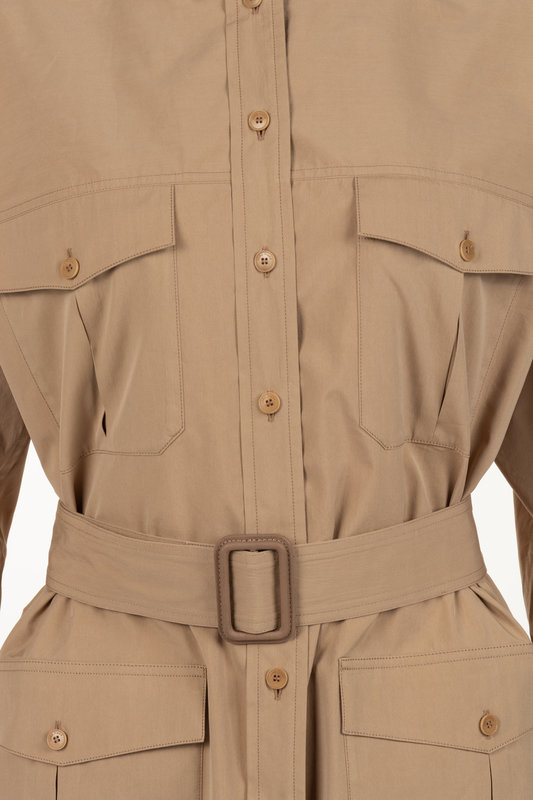 Khaki cotton/silk blend safari-style shirt with pointed collar, shoulder epaulettes, four front flap patch pockets, center front button closure and detachable belt.