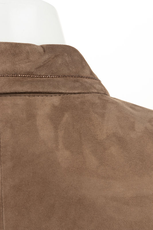 Dark beige suede leather jacket with metal bead embellished pointed collar and cuffs, four front flap patch pockets, and center front snap closures with elastic zip cord hem.