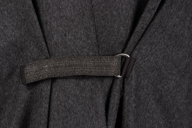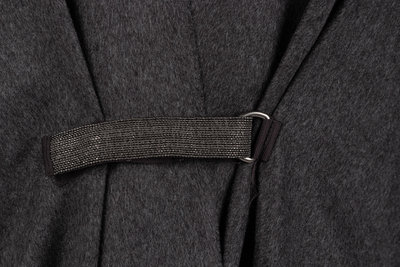 Gray felted silk fringe wrap with stitched side seams and front steel cut beaded strap.