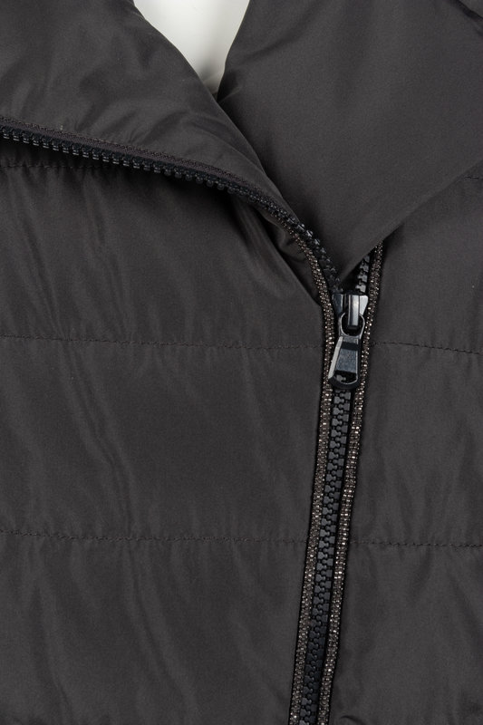 Dark grey green polyester quilted vest with zipper closure trimmed with grey beaded chain detail.