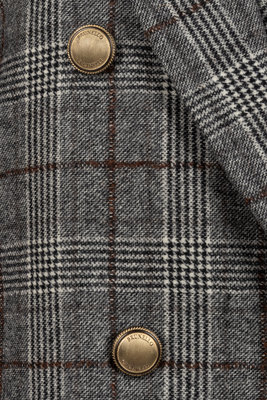 Grey, brown, black and white wool plaid double breast coat with single notch lapel, long sleeves, waist pockets, and front button closure.