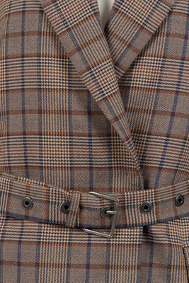 Brown and blue wool jacket with peak notched collar, front snap closure, and matching belt.