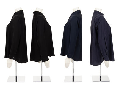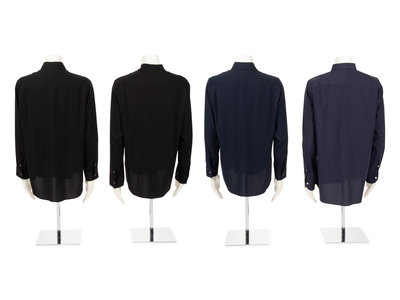 Black silk blend crepe dress shirt with pointed collar, barrel cuff long sleeves, and hidden front button closure.