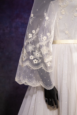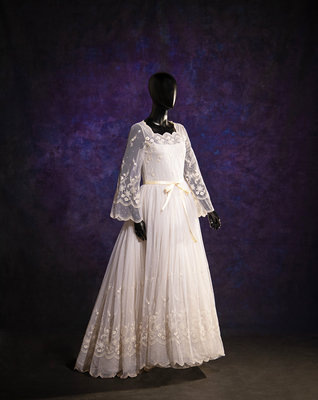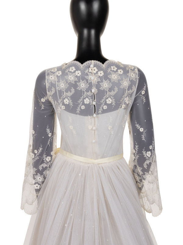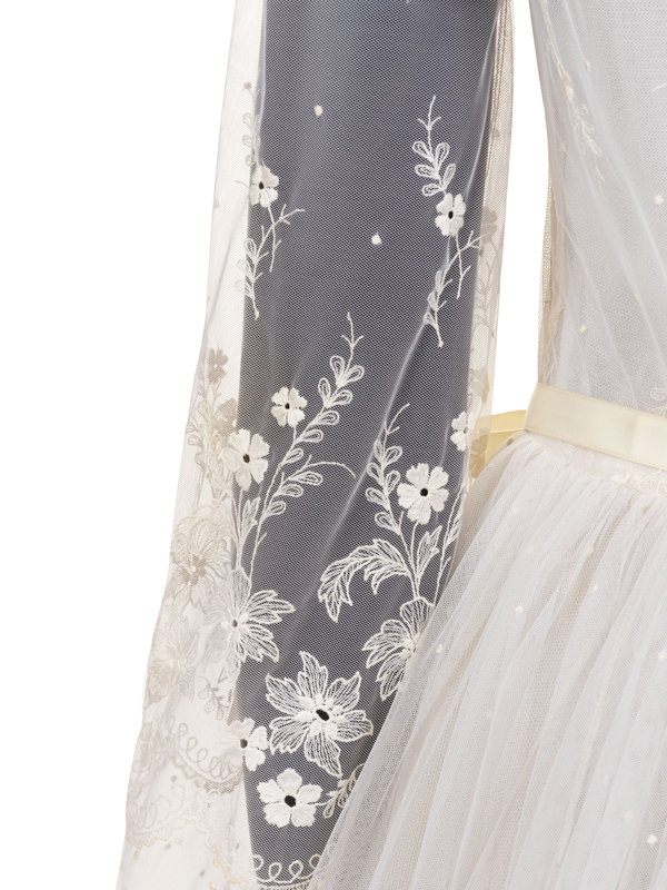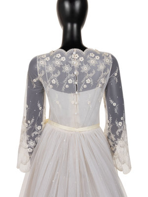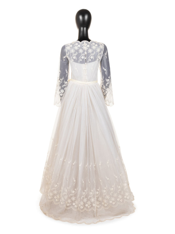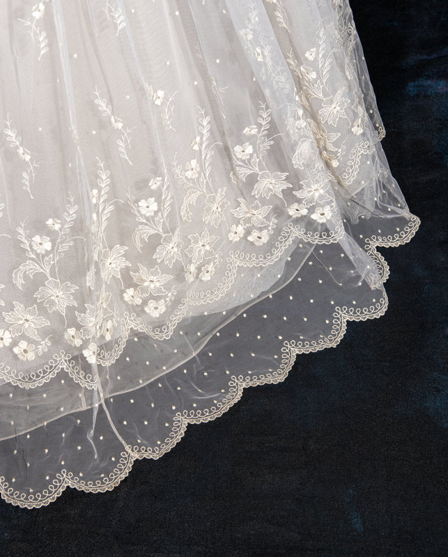 White nylon net embroidered with white silk thread floral wedding dress with scalloped net neckline and long sleeve bodice lined with silk chiffon, a full layered net and organza skirt with synthetic horsehair braid, and center back zipper and button closure with attached satin ribbon tie at waist.