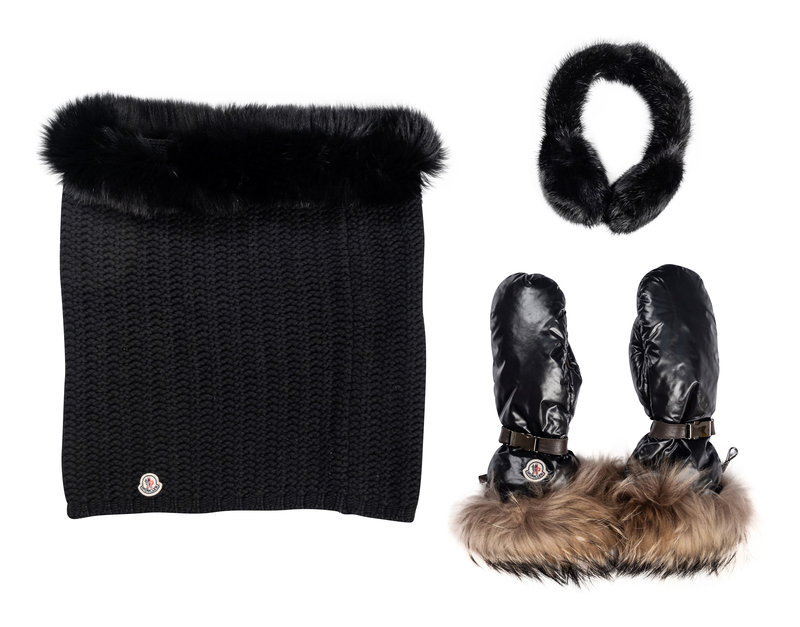 A Collection of Fur-Trimmed Winter Accessories: Moncler Mittens, Moncler Knit Collar, Prada Earmuffs