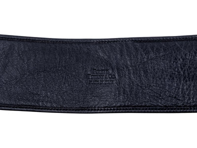 Large sterling silver horseshoe shaped buckle with black leather belt. Comes with dust bag.