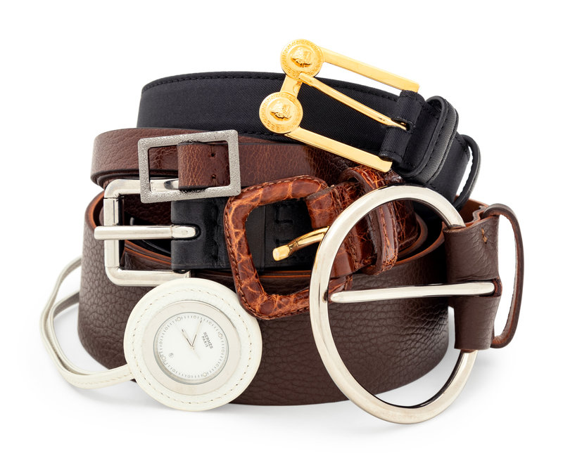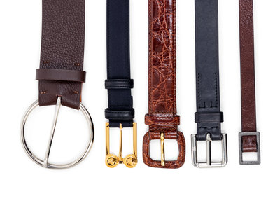 Black woven and leather faced belt with gold-tone prong buckle with medusa heads.