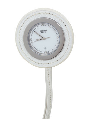 Silver-tone hand bag Swiss made timepiece encase in white leather with strap. Dust bag and box included.