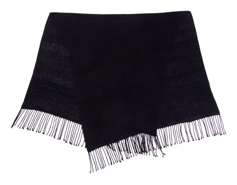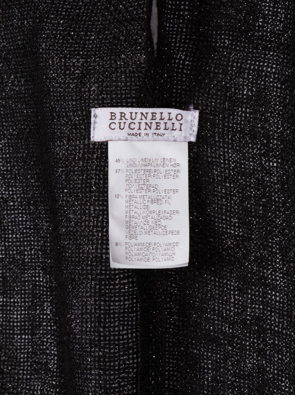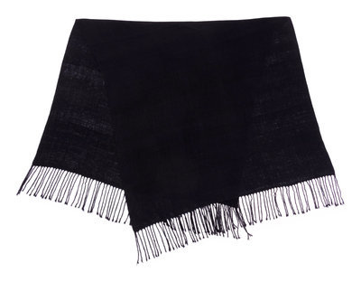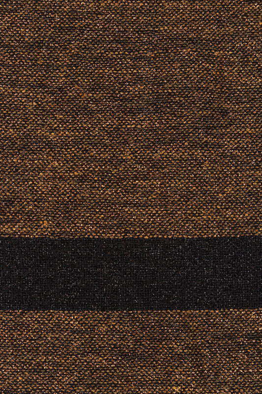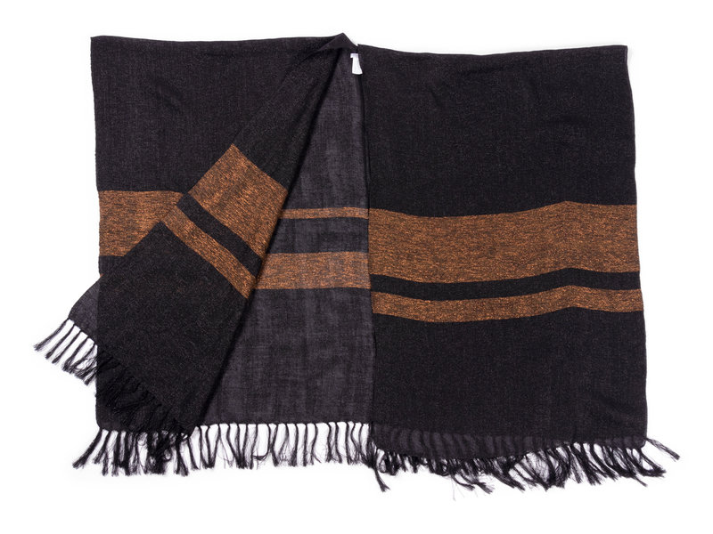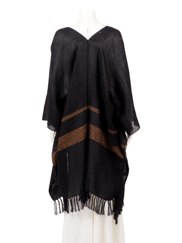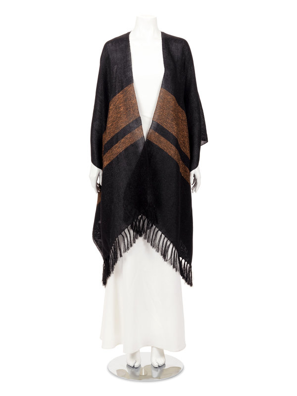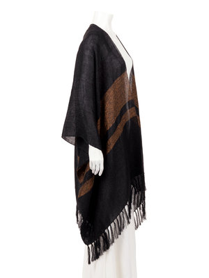 Black and copper-tone striped linen/polyester blend lamé open front poncho/shawl with fringe.