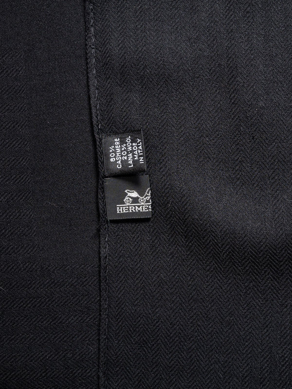 Black cashmere/wool blend twill scarf with fringed edges and woven in "H".