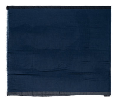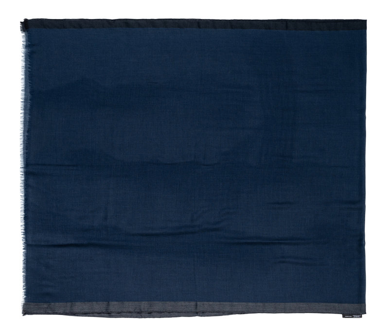 Dark blue cashmere with gray stripe scarf and edged in fringe.