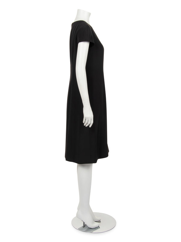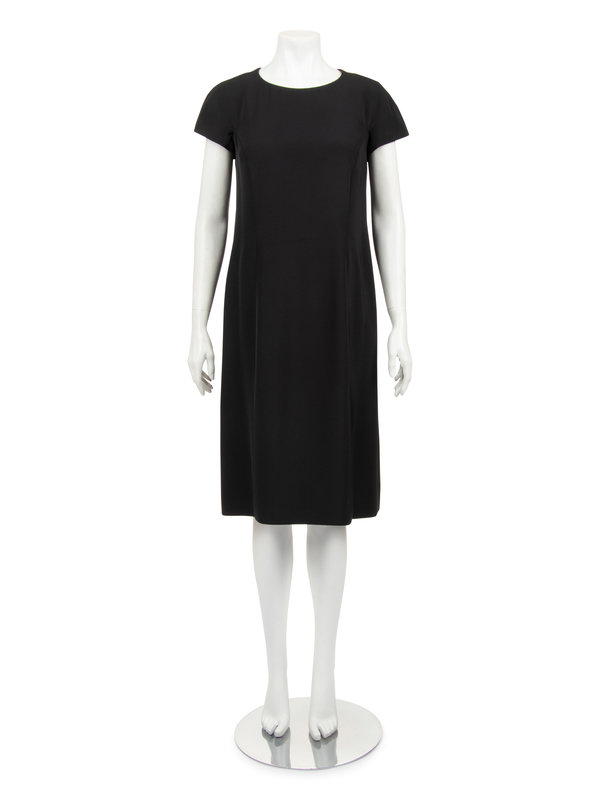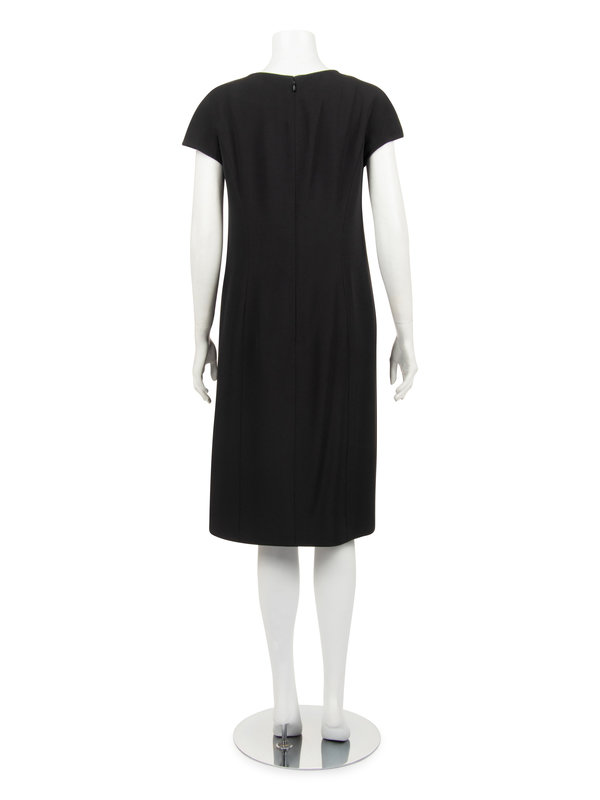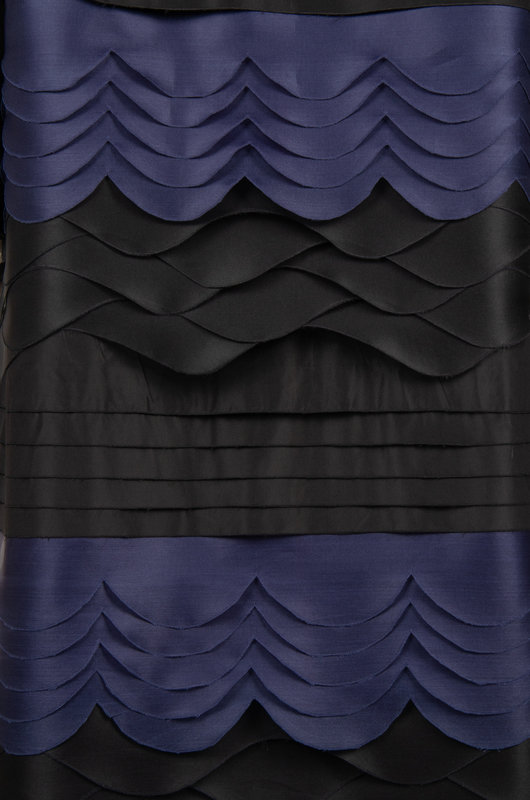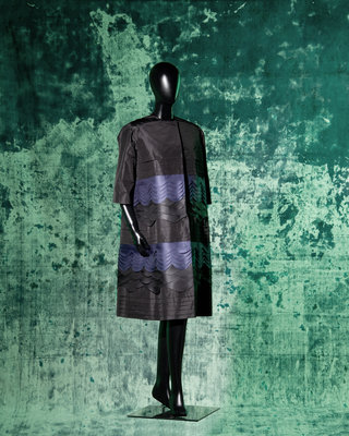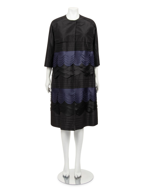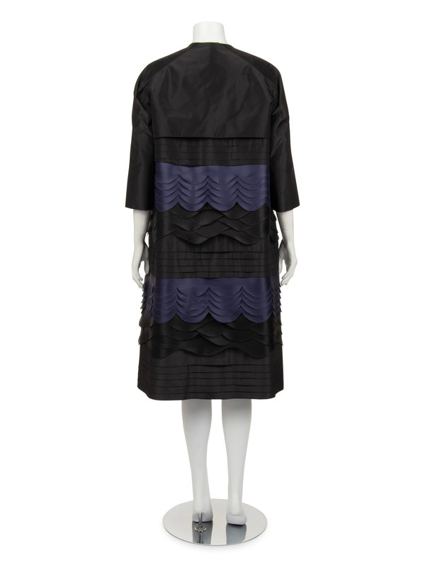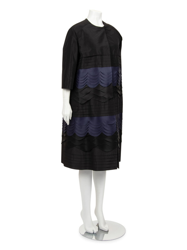 Haute couture two-piece ensemble including a black silk cap sleeve shift dress with scoop neckline and center back zipper closure; paired with black and dark blue silk taffeta swing coat with scalloped bands detail, jewel neckline, raglan sleeves, and front neck snaps closure.
