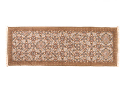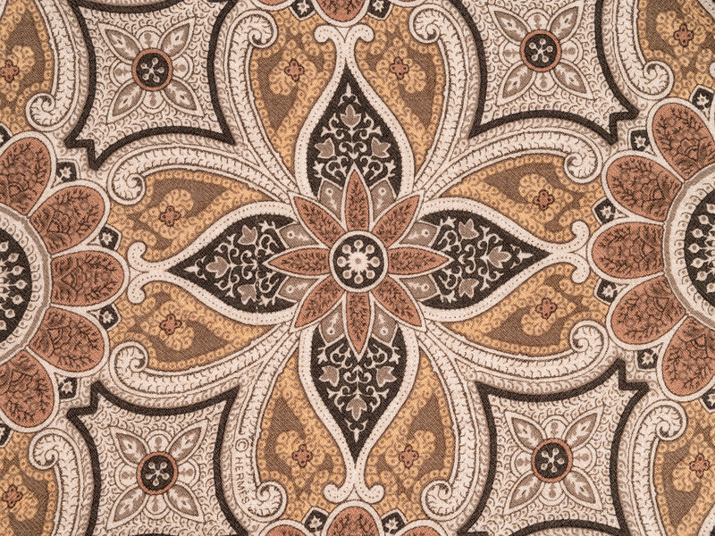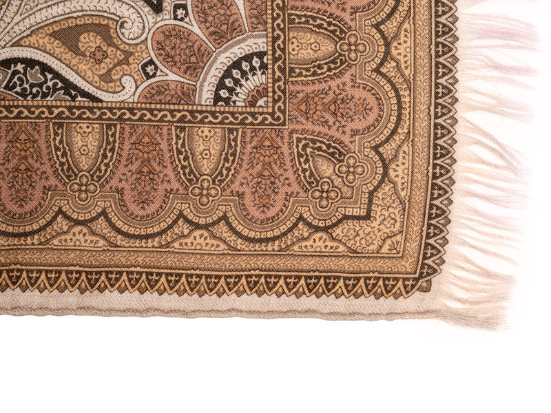 Cashmere/silk blend scarf with brown, tan, mauve paisley motif.