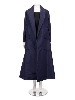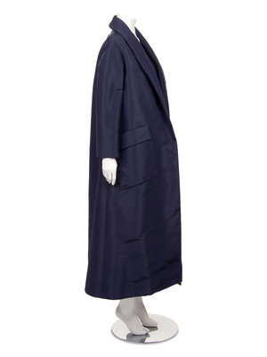 Blue silk taffeta long sleeve evening coat with exaggerated shawl collar, hip patch pockets, and open front.