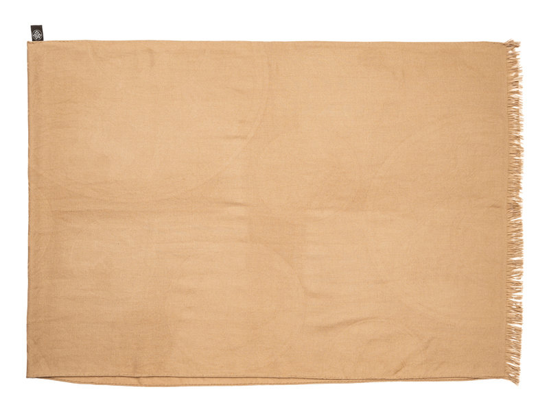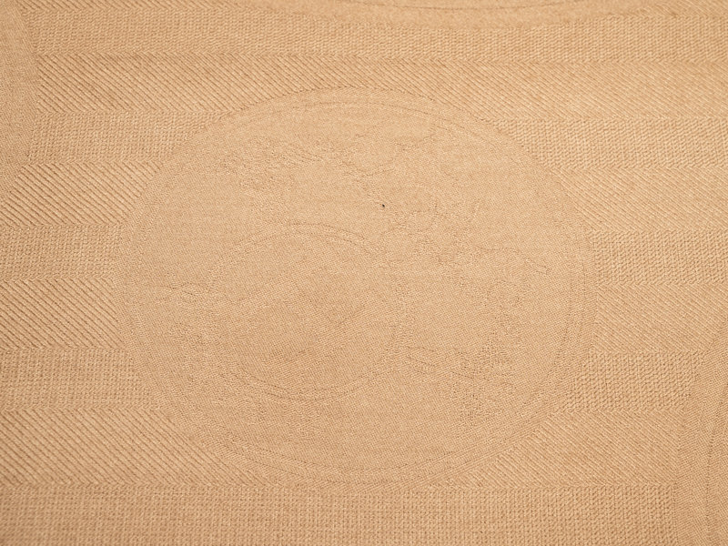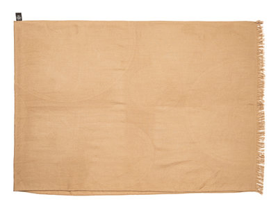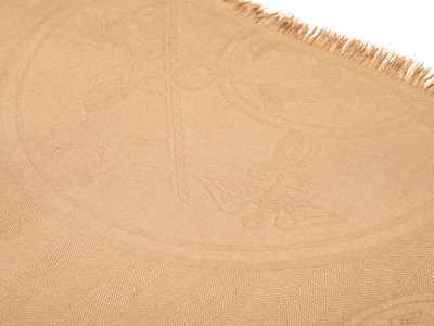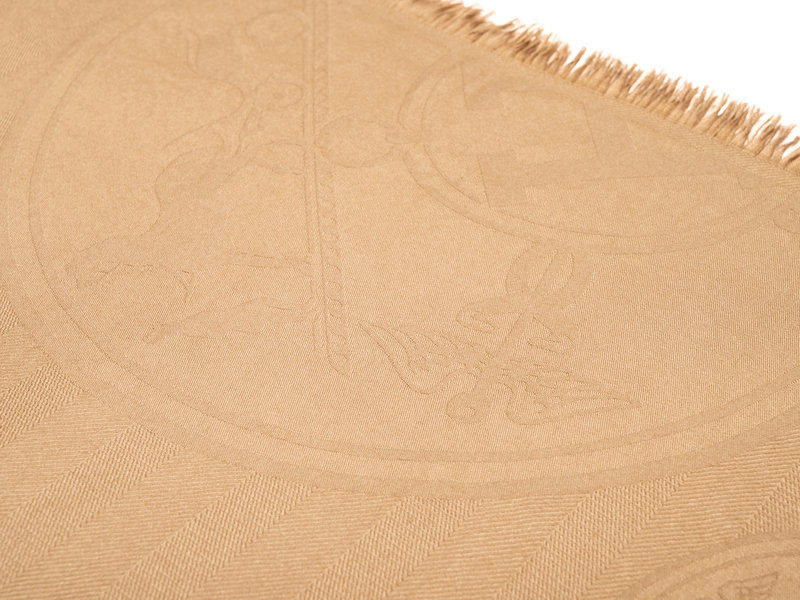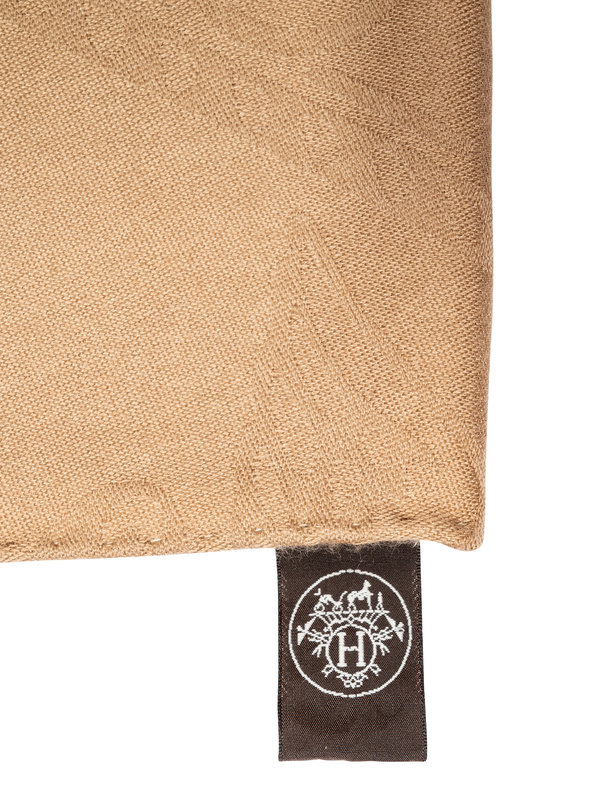 Tan cashmere/silk blend jacquard scarf with Hermès logo pattern and fringed short edges.