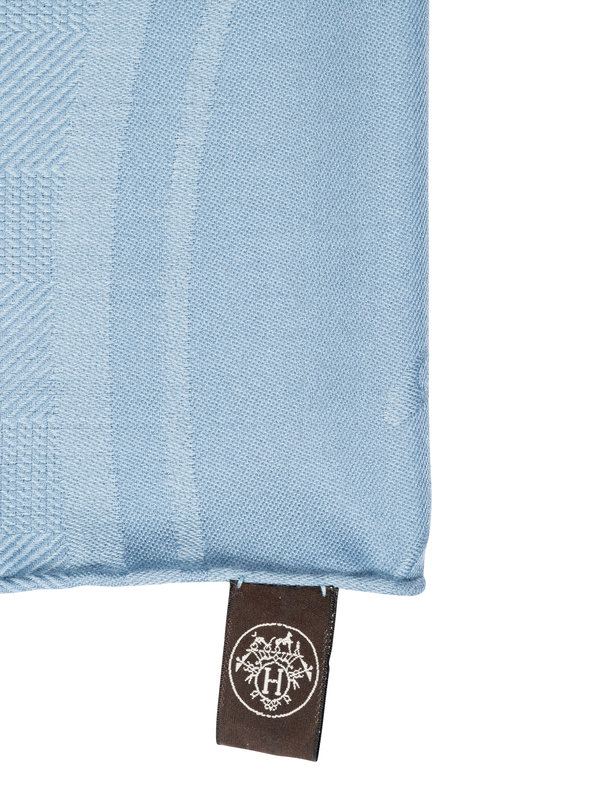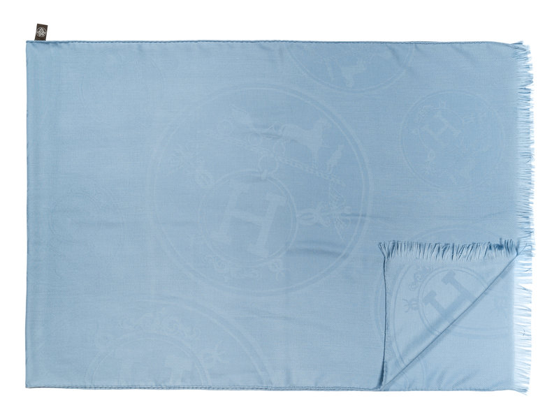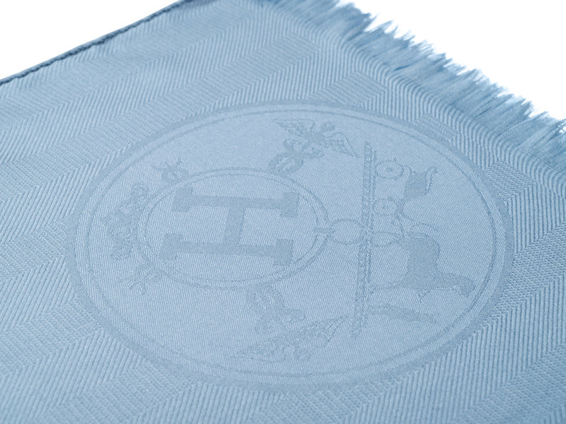 Light blue cashmere/silk blend jacquard scarf with Hermès logo pattern and fringed short edges.