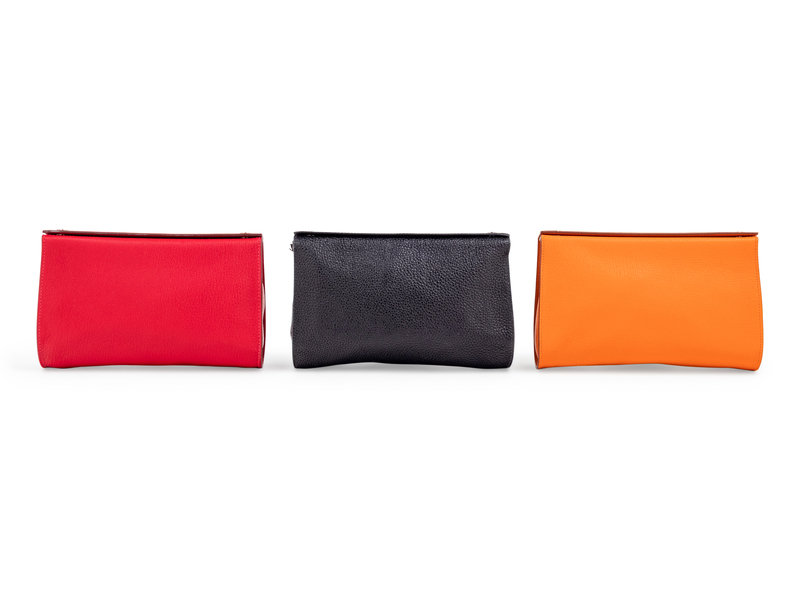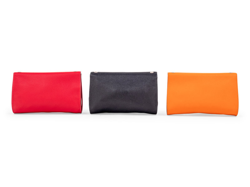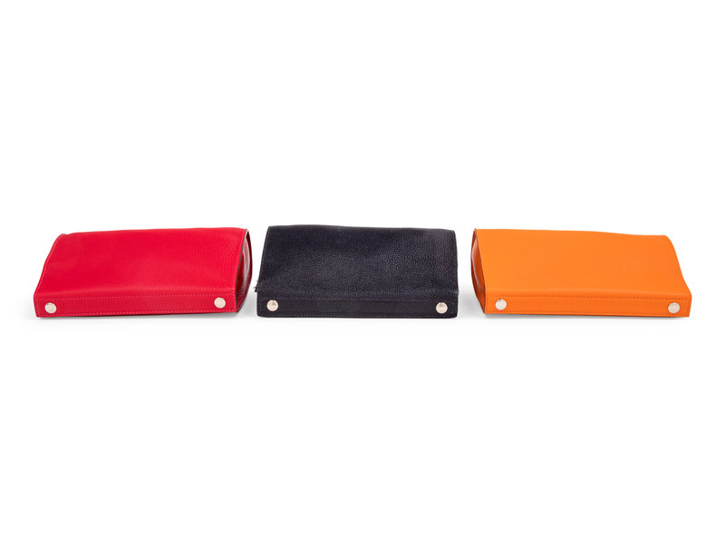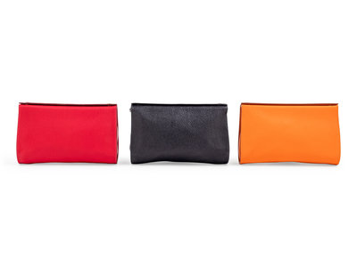 Orange leather Karo Trousse cosmetic pouch with top snap closures and lined in red waterproof material.