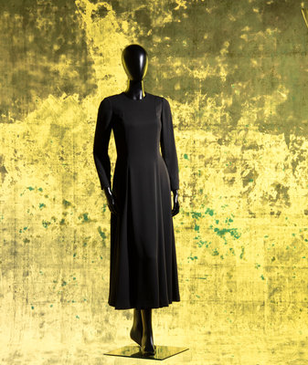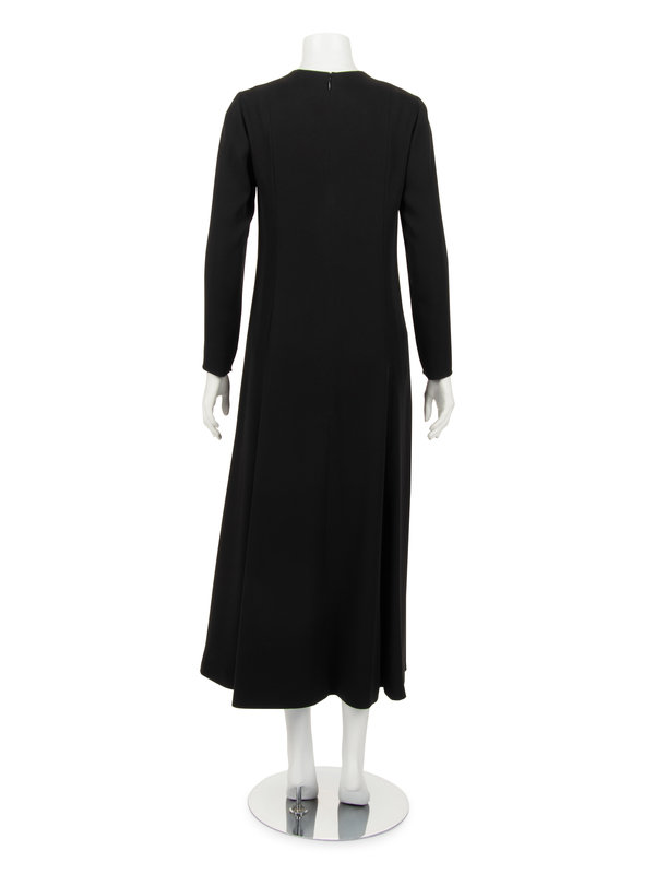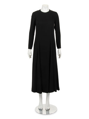 Black silk crepe long sleeve dress with scoop neckline, full skirt, and center back zipper closure.