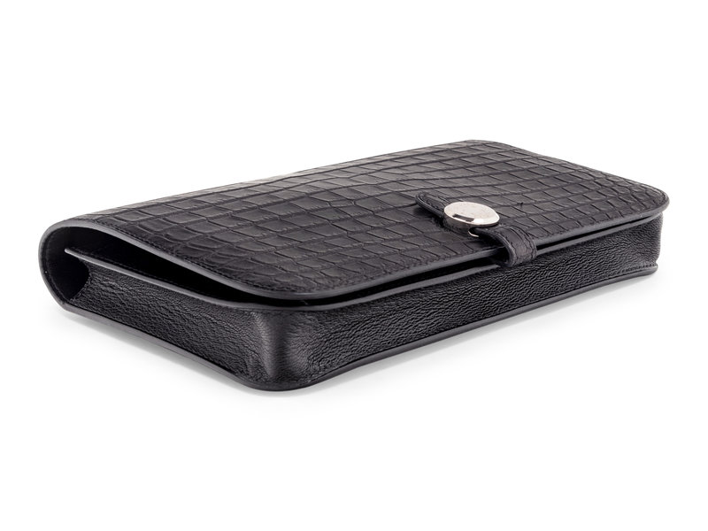 Black crocodile Dogon Duo wallet lined in black leather, one main compartment with three front slip pockets, and silver-tone Clou de Selle closure.