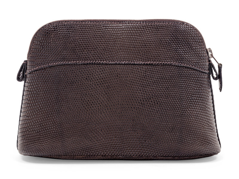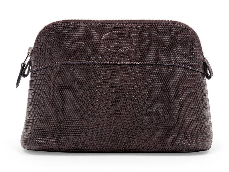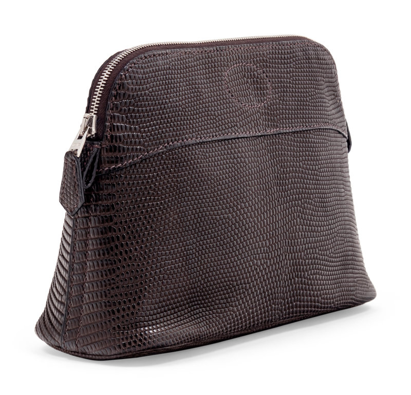 Brown Salvator lizard skin Bolide cosmetic pouch lined in brown leather and top zipper closure.