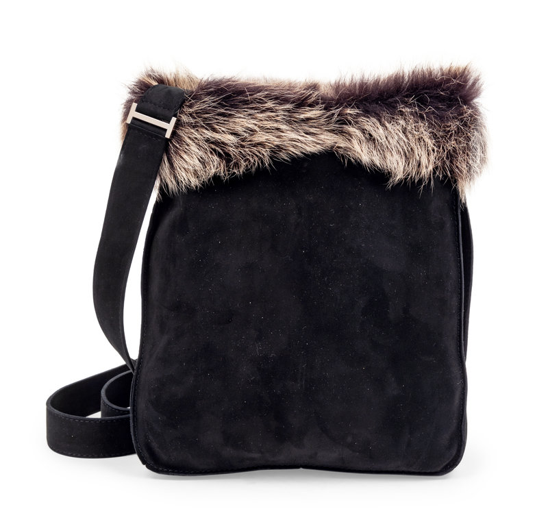 Black suede cross body bag trimmed with fur and leather stitching detail.