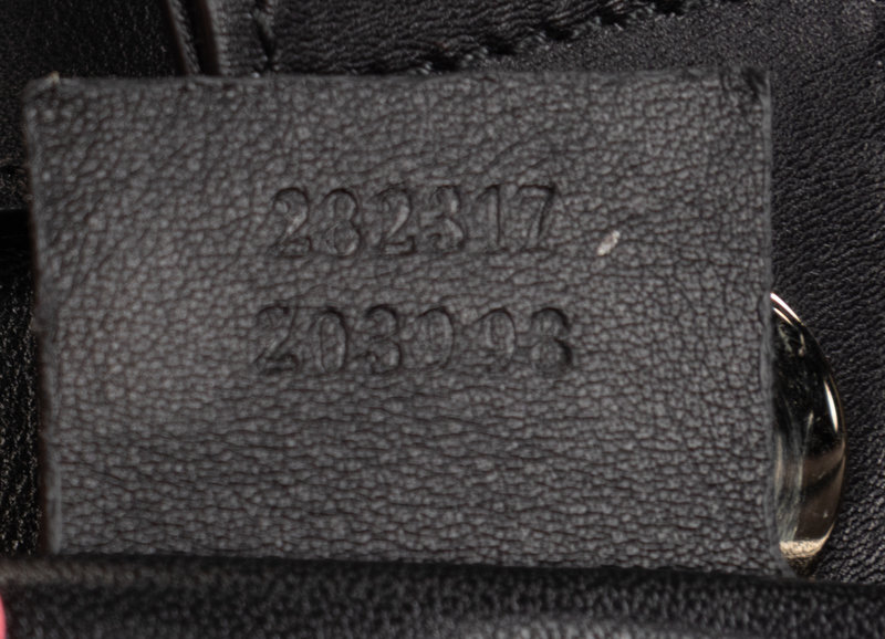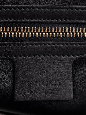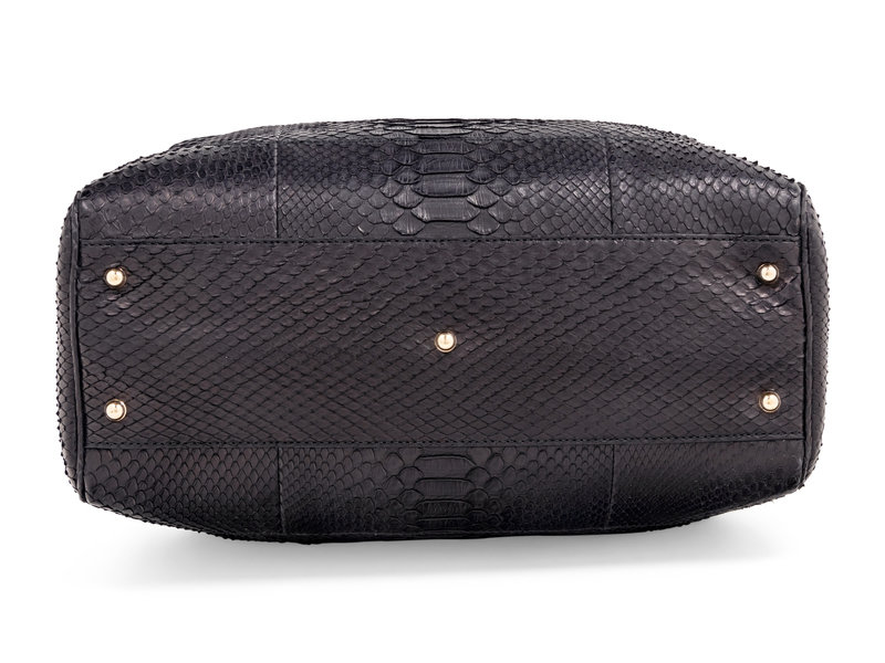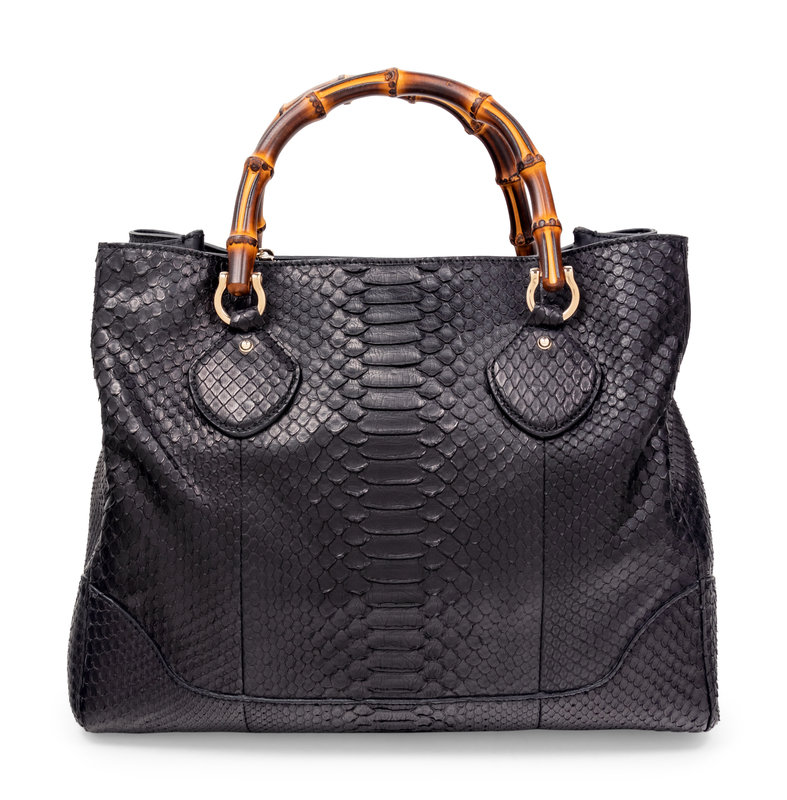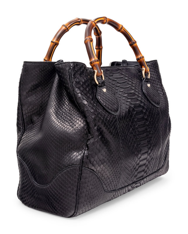 Black python dual compartment tote bag with bamboo top handles attached with gold-tone hardware, middle zipper pouch, and top magnetic snap closure.