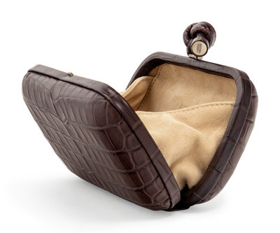 Brown crocodile pochette box clutch with knotted detail at closure and lined in beige suede.