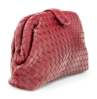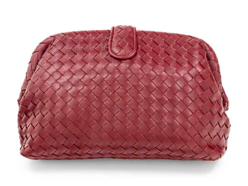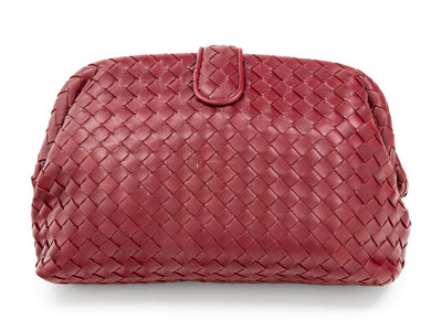 Burgundy red Intrecciato leather "The Lauren 1980" clutch lined in brown suede with frame top and snap closure.