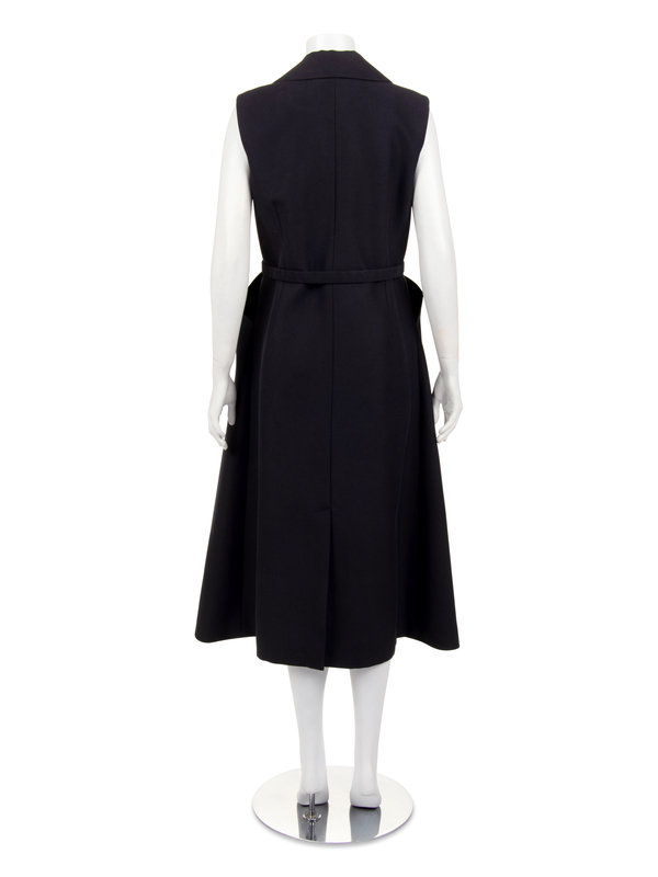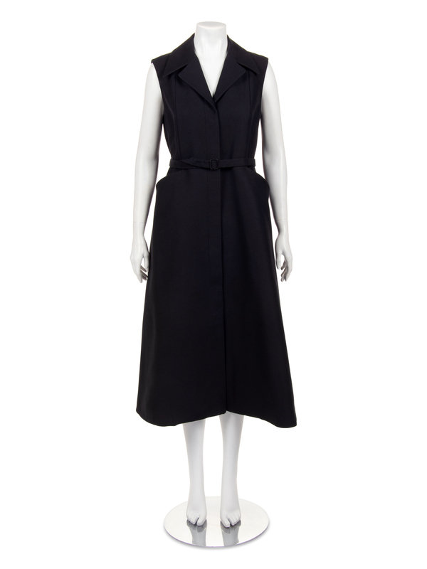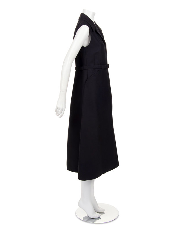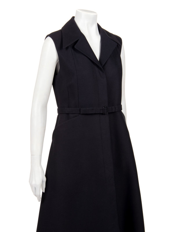 Black silk sleeveless dress with exaggerated point notch lapel, pockets at hip, hidden center front button closure, and matching belt.