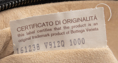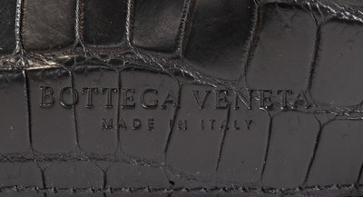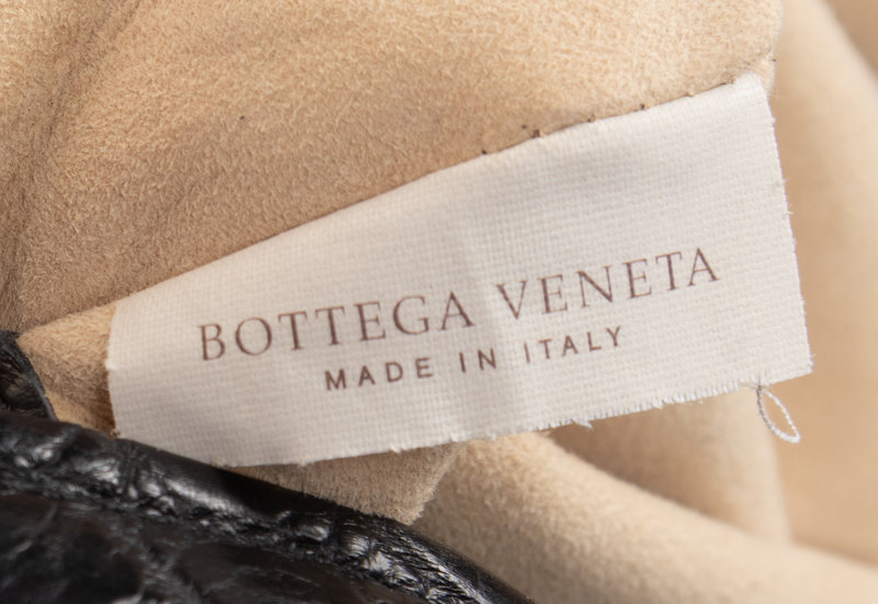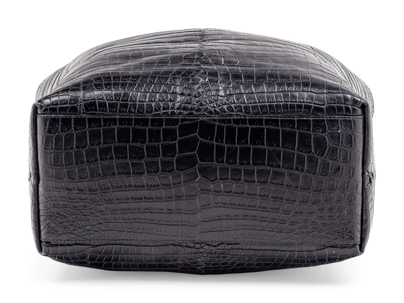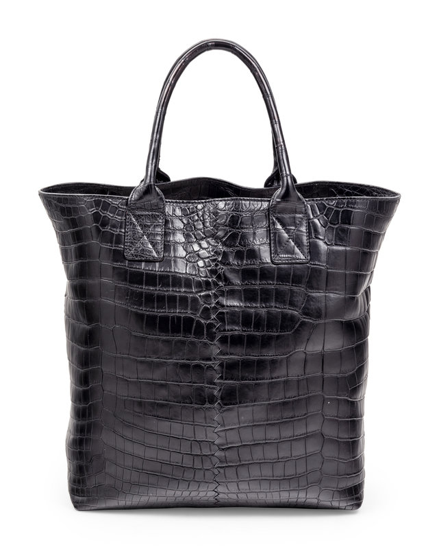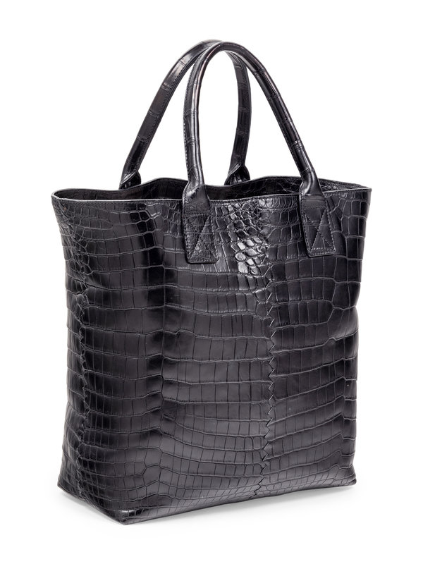 Black crocodile tote bag lined in ivory suede and dual top handles.