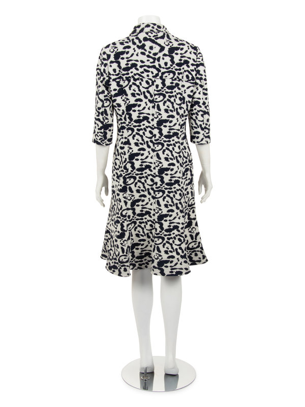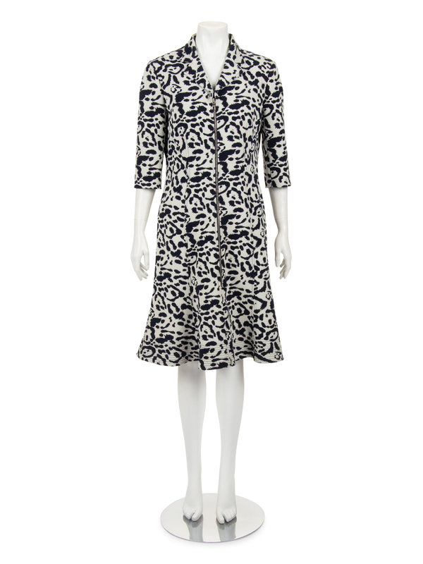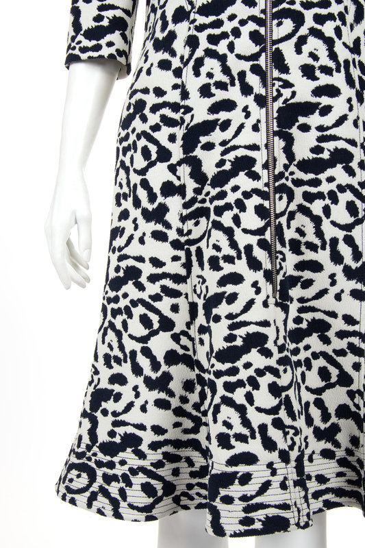 White and navy animal patterned polyester blend zip front dress with single notch lapel collar, 3/4 sleeves, and flared skirt hem.