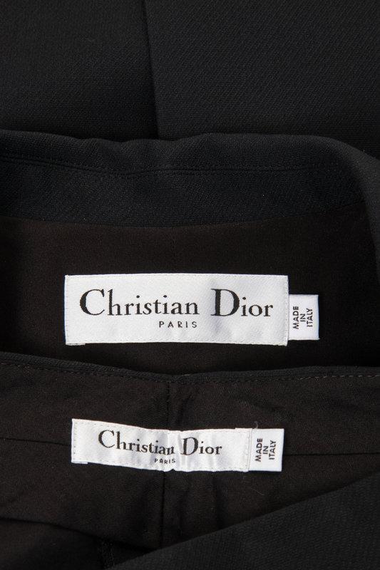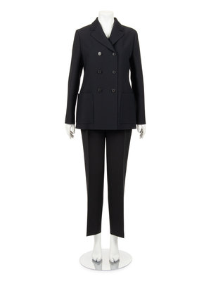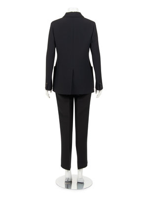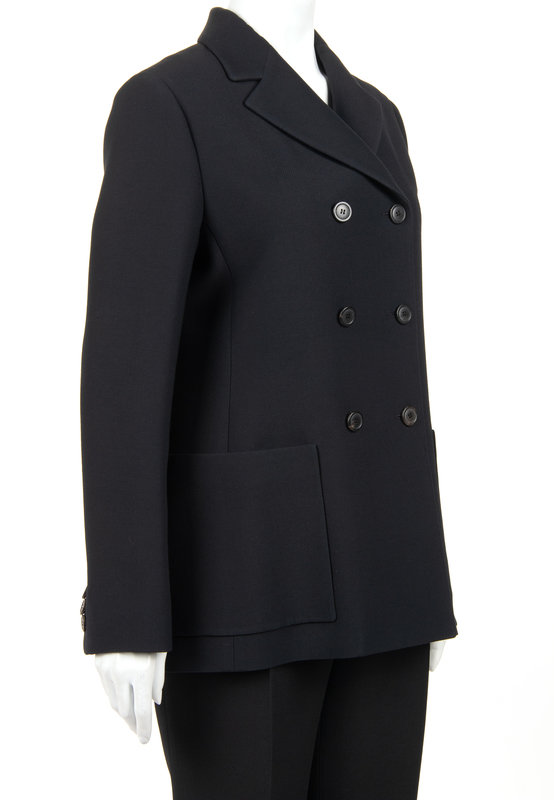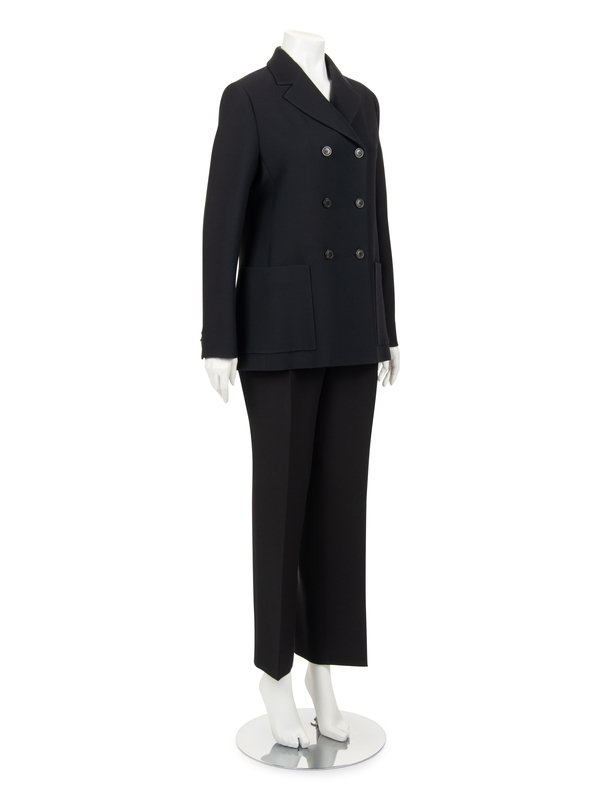 Black wool/silk blend crepe two-piece suit including a single notch lapel double breast jacket with long sleeves, front hip patch pockets, and front button closures; paired with matching straight leg pants.