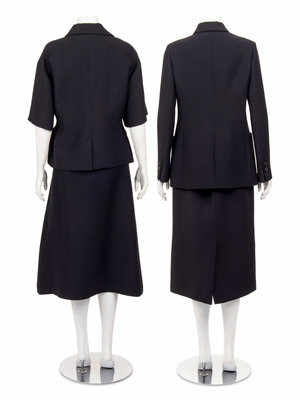 Black wool/silk blend two-piece skirt suit including a short sleeve jacket with rolled pointed collar, inseam waist pockets, and center front button closure; paired with matching A-line skirt.