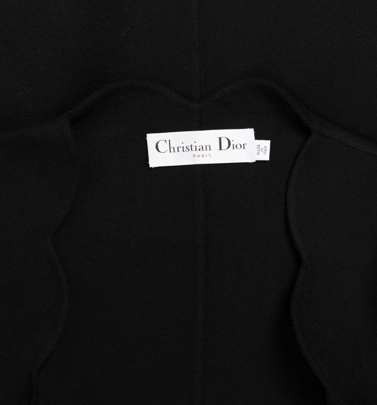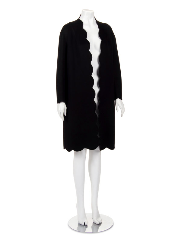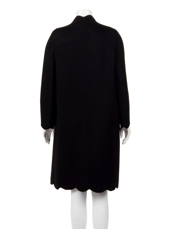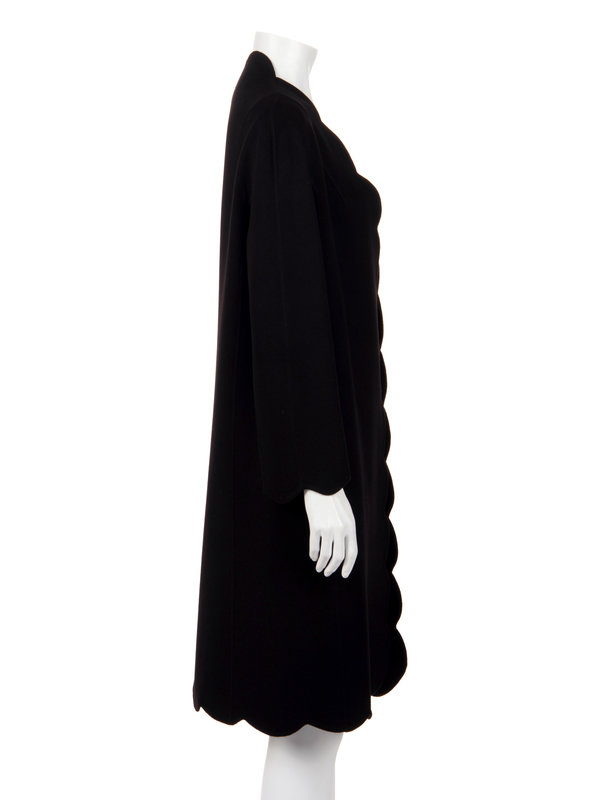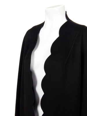 Black cashmere clutch front long jacket with scalloped edges, long sleeves, inseam side seam pockets, and open front.