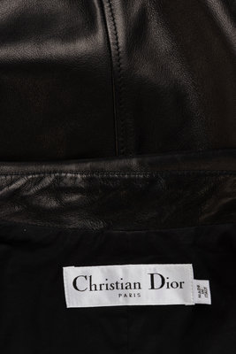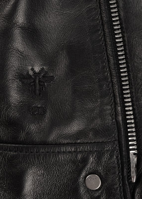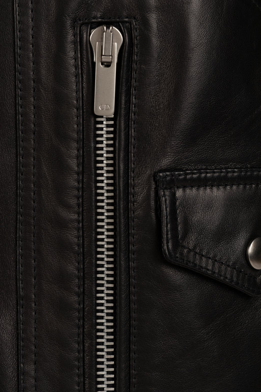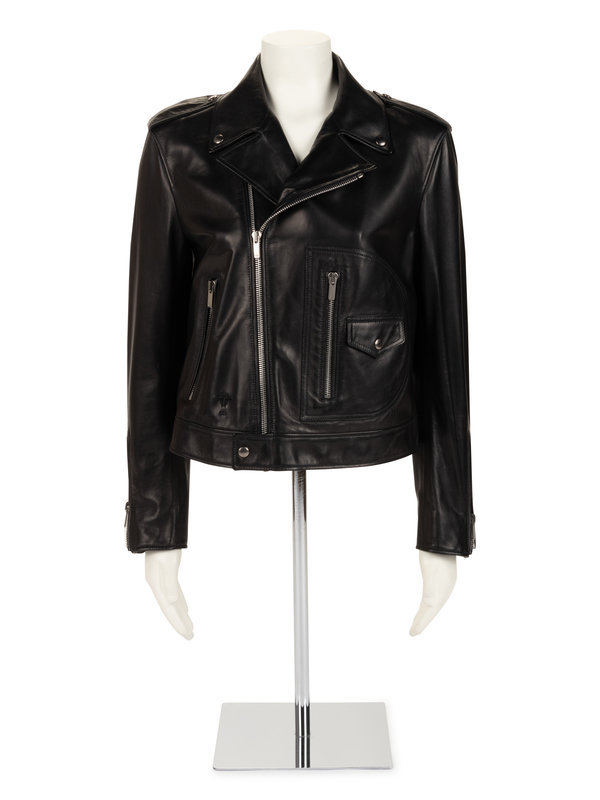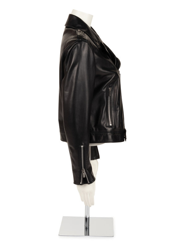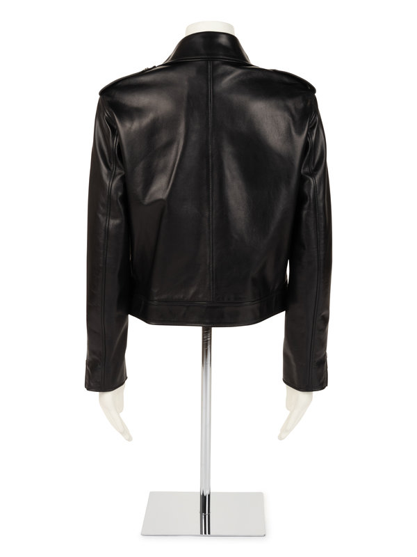 Black lambskin leather biker-style jacket with shoulder epaulettes, zippered pockets, and front asymmetrical zipper closure.