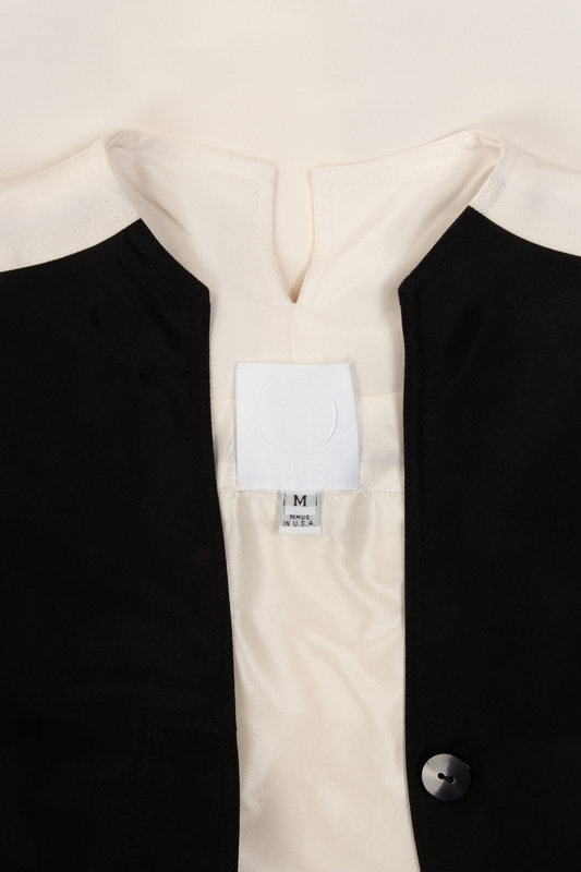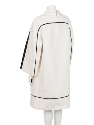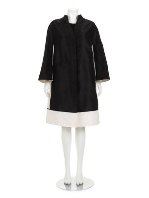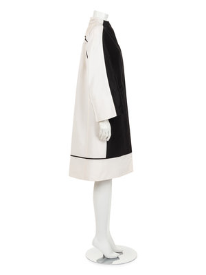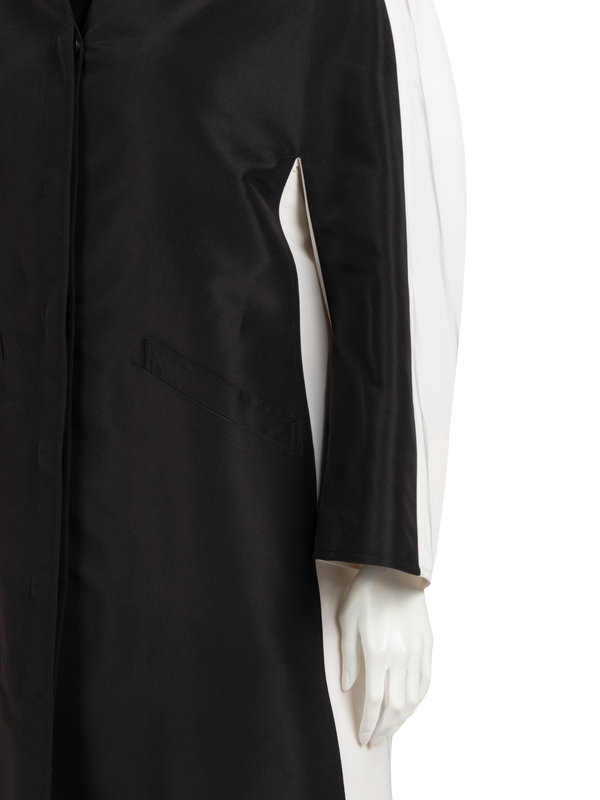 Black and white color block silk taffeta mod coat with funnel style collar, pieced raglan style flared sleeves, front welted hip pockets, and hidden center front button closure.
