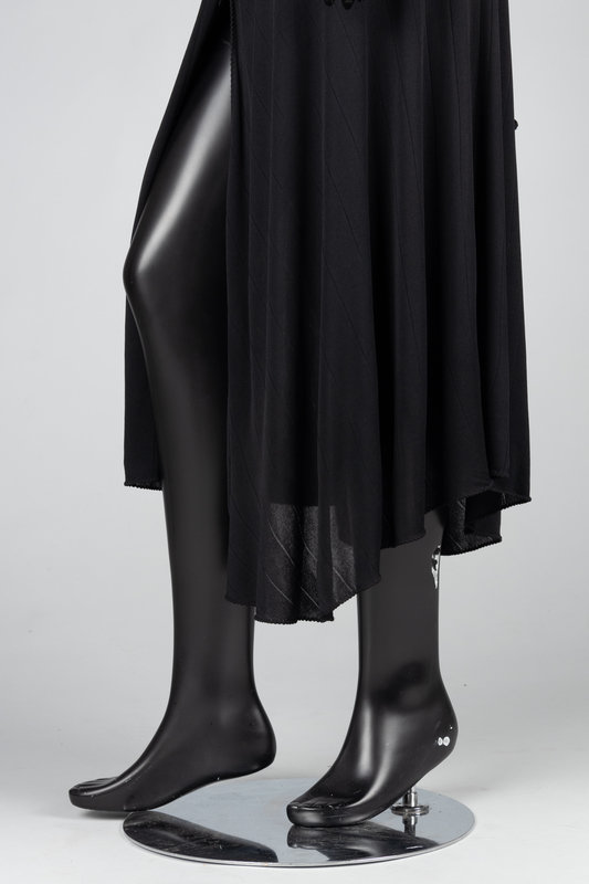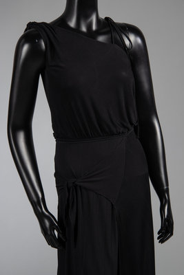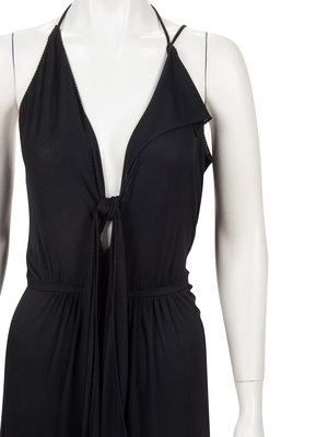 Black jersey knit halter dress with tieable neckline, rolled jersey straps for bust tie, and tieable paneled skirt.